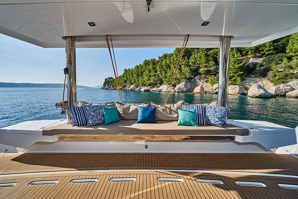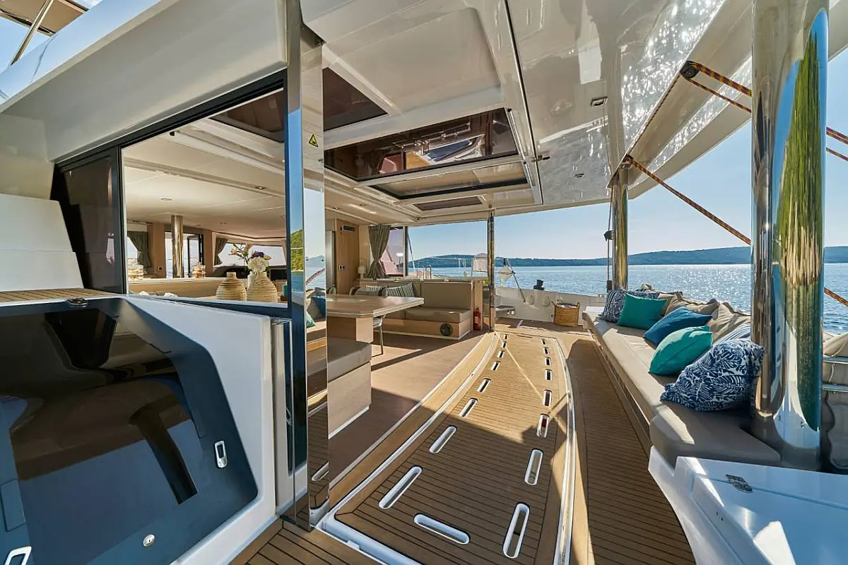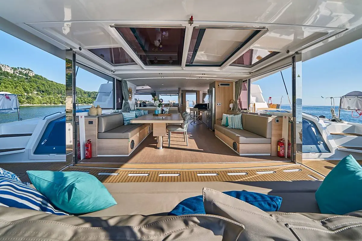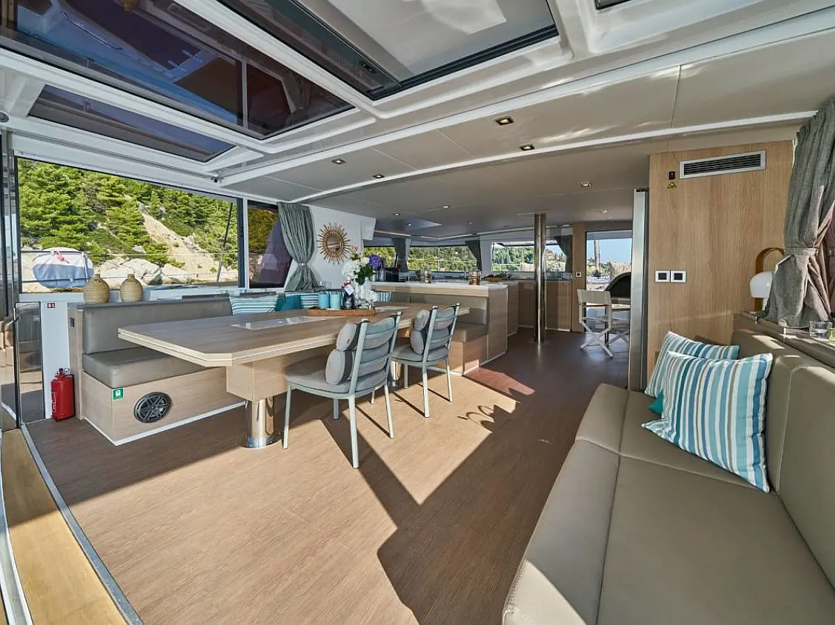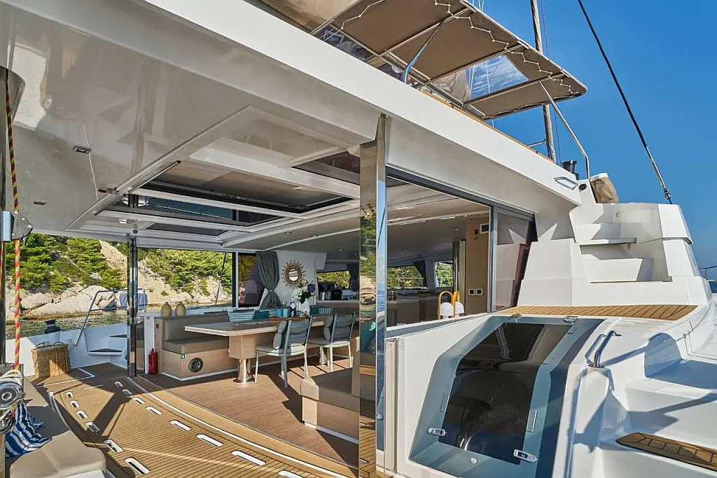 Klimaanlage, Bimini, Cockpit-Kissen, Beiboot, Elektrische Winch (Segel), Elektrische Toilette, Kaffeemaschine, Flybridge, Kühlschrank, Generator, Inverter, Solar-Panele, Teak Cockpit, Wassermacher