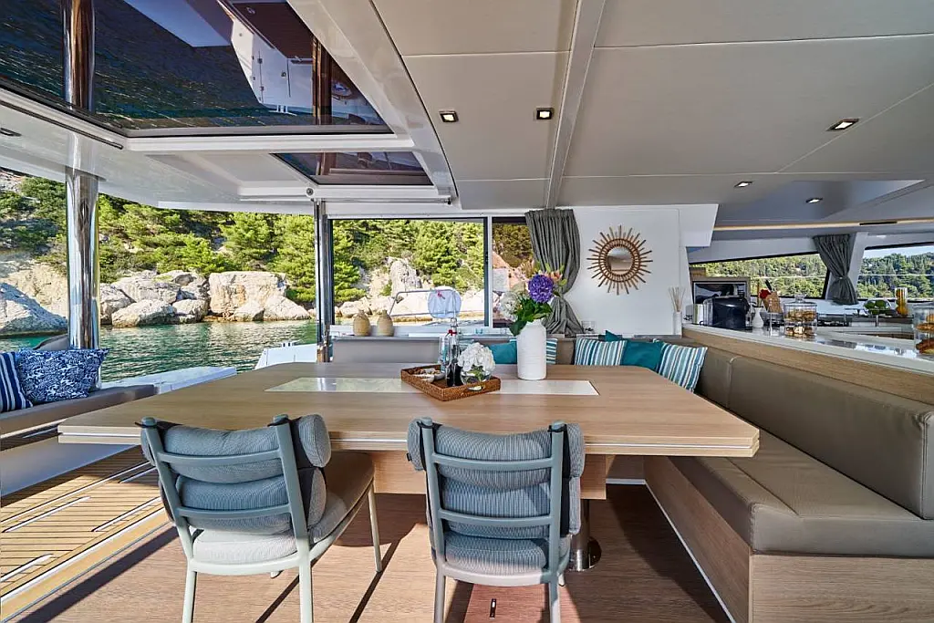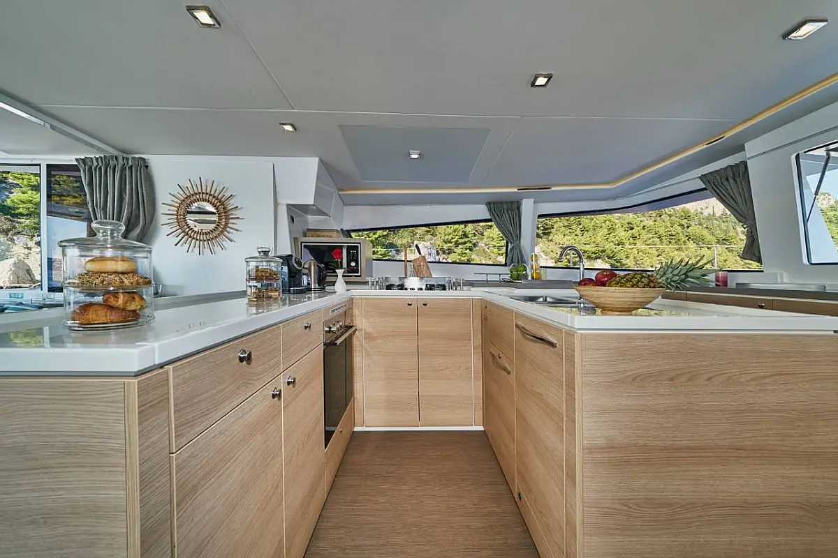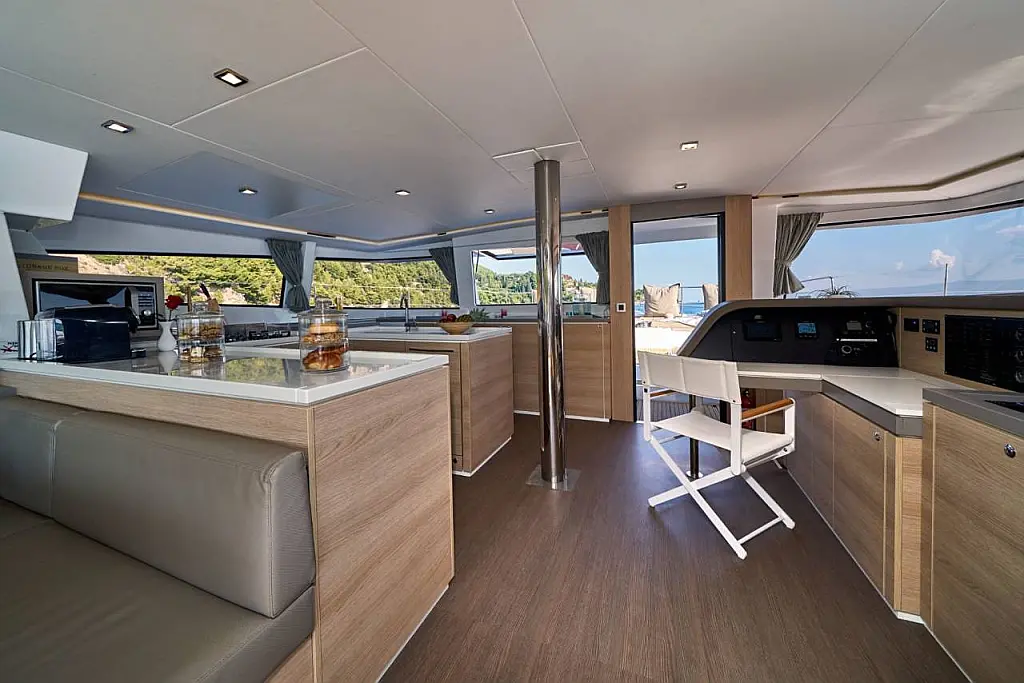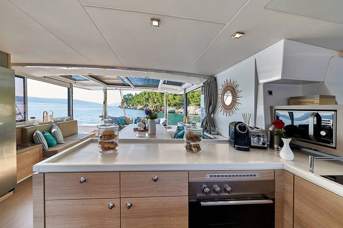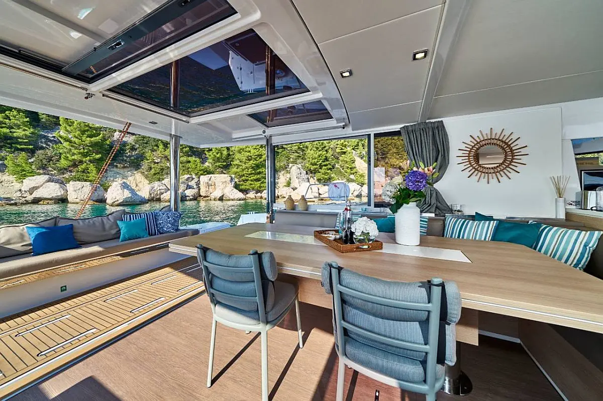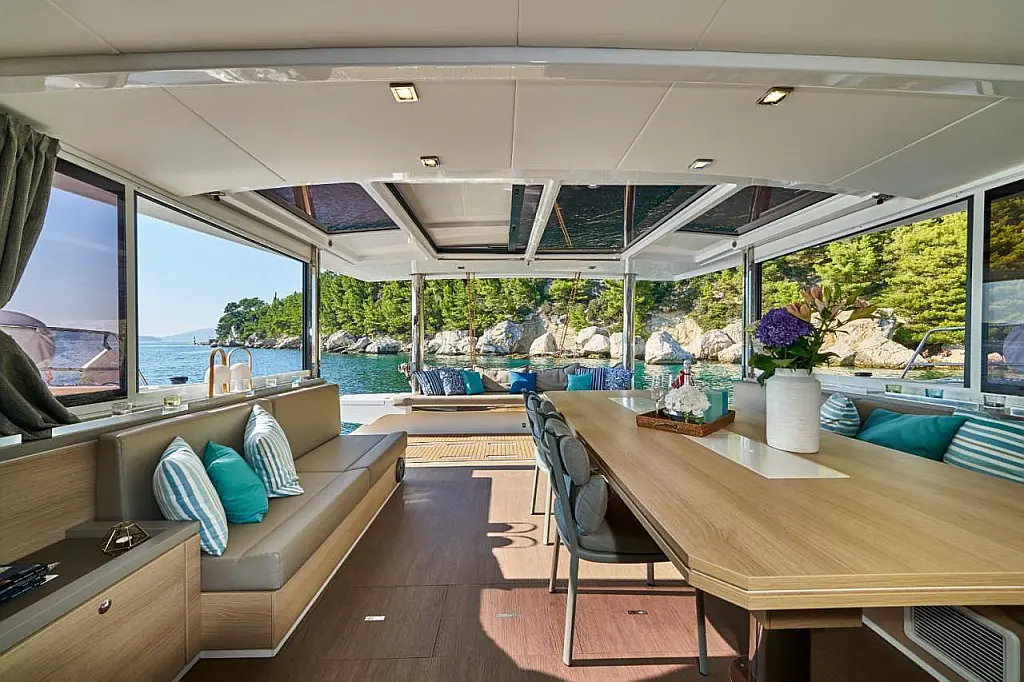 Klimaanlage, Bimini, Cockpit-Kissen, Beiboot, Elektrische Winch (Segel), Elektrische Toilette, Kaffeemaschine, Flybridge, Kühlschrank, Generator, Inverter, Solar-Panele, Teak Cockpit, Wassermacher
