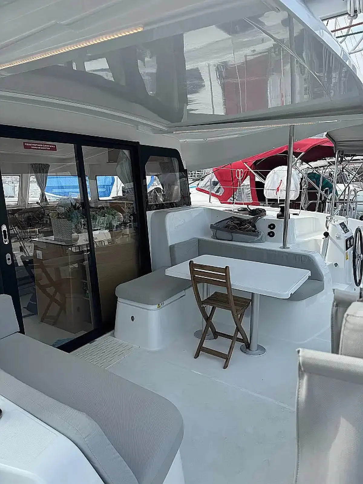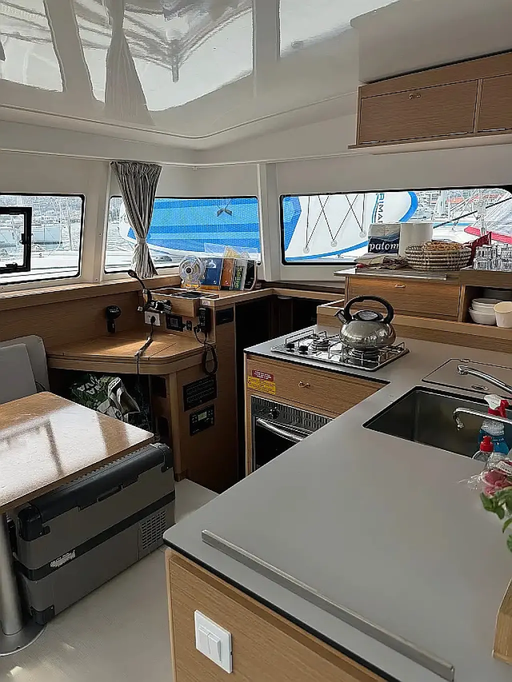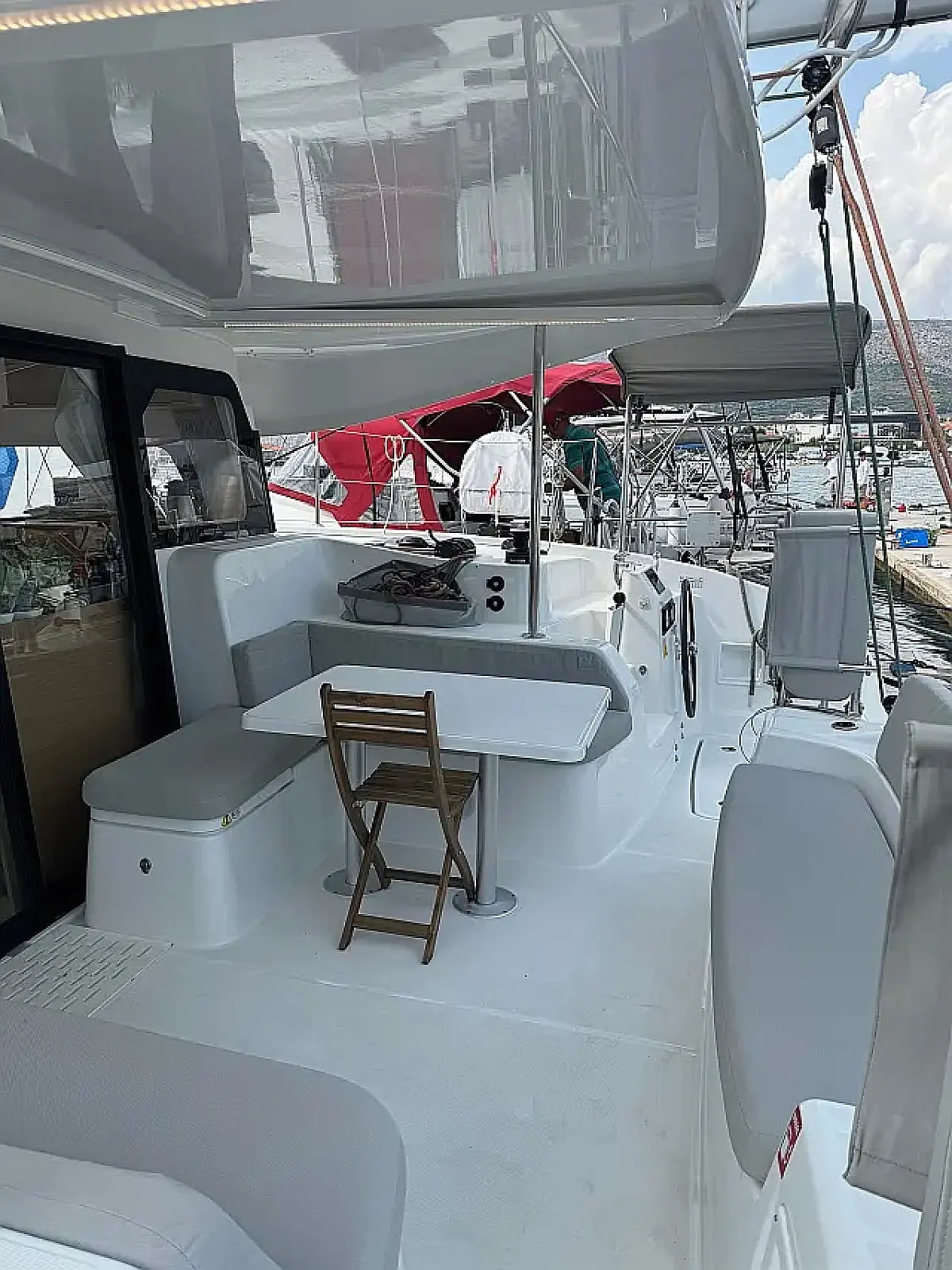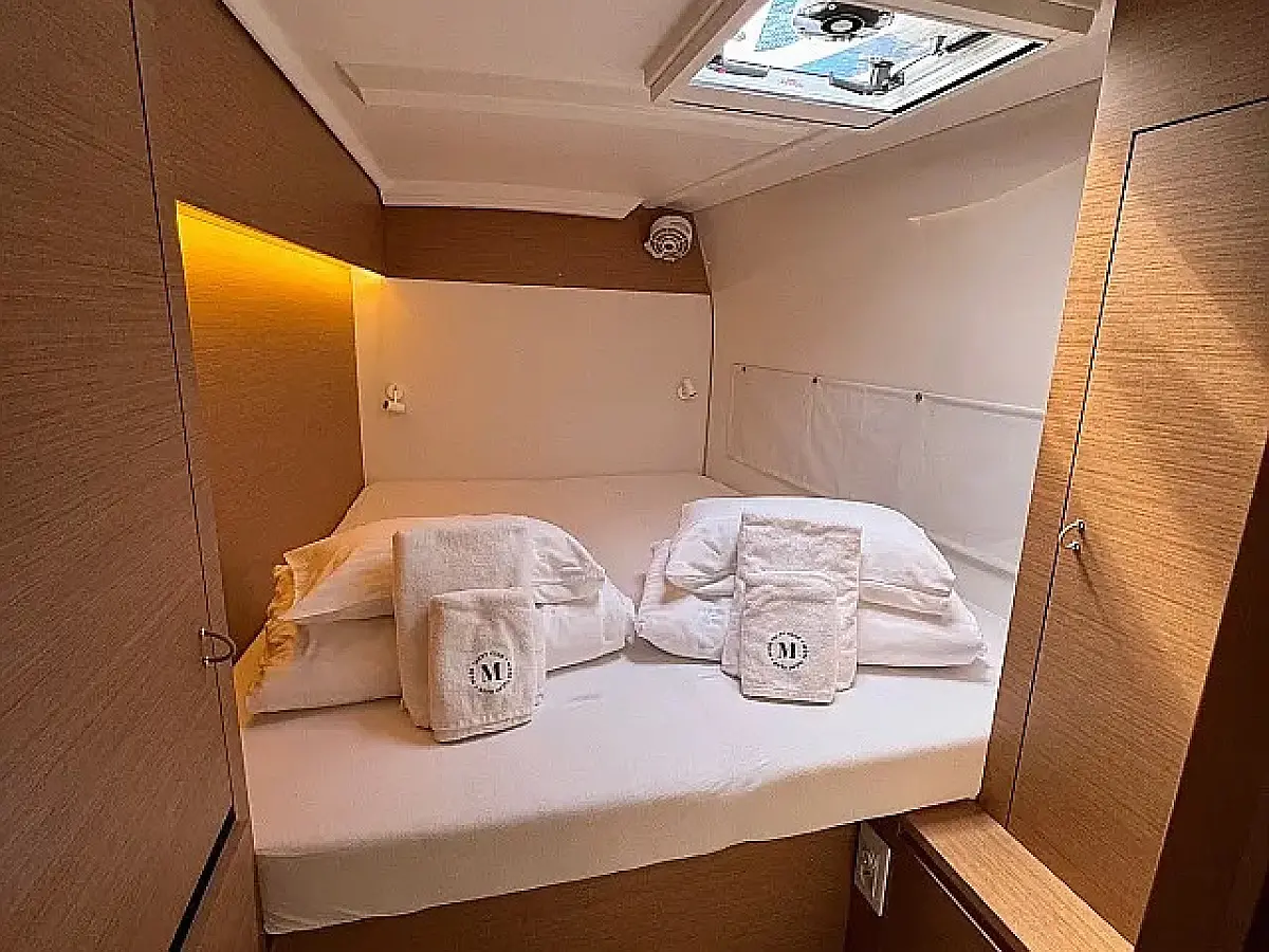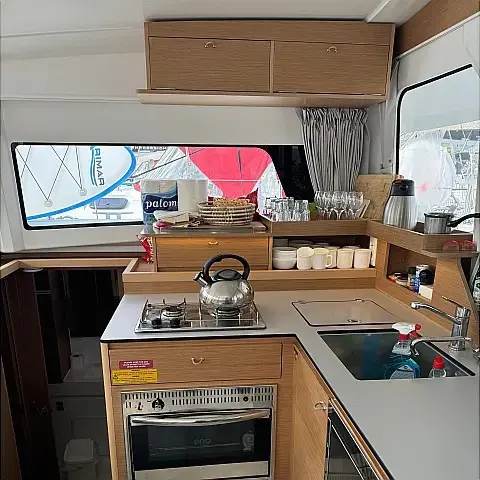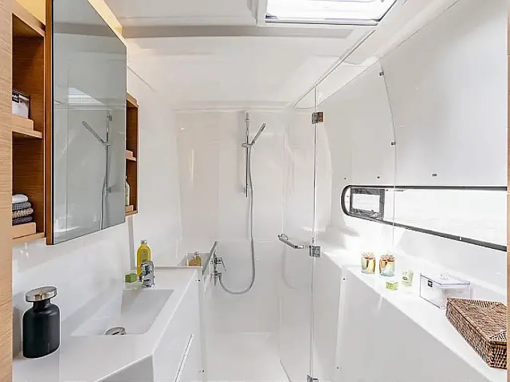 Klimaanlage, Bimini, Cockpit-Kissen, Lautsprecher im Cockpit, Beiboot, Kaffeemaschine, Kühlschrank, Elektrische Toilette, Generator, Heizung, Fäkalientank, Inverter, Außenbordmotor, Solar-Panele, Wi-Fi und Internet