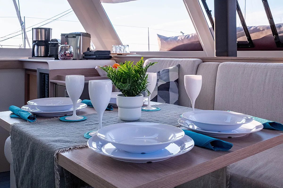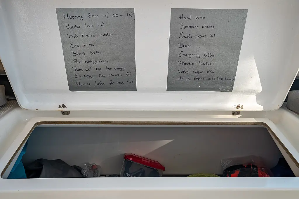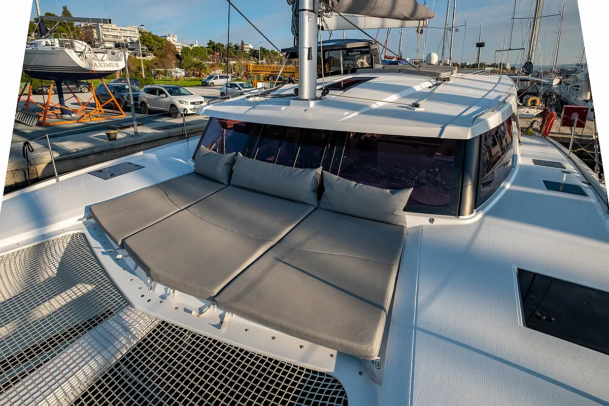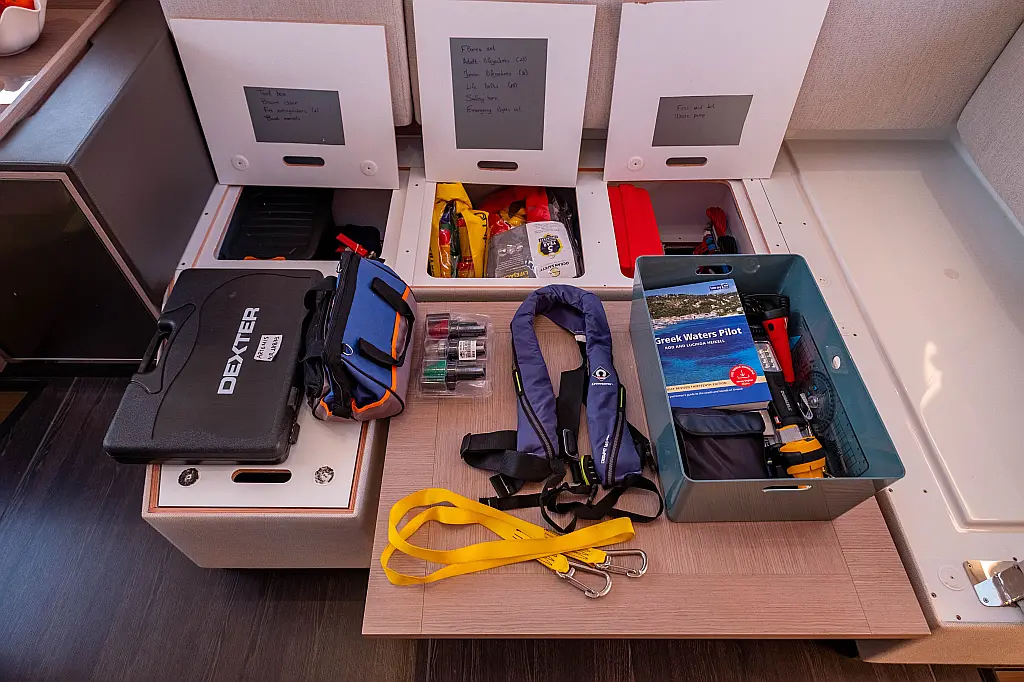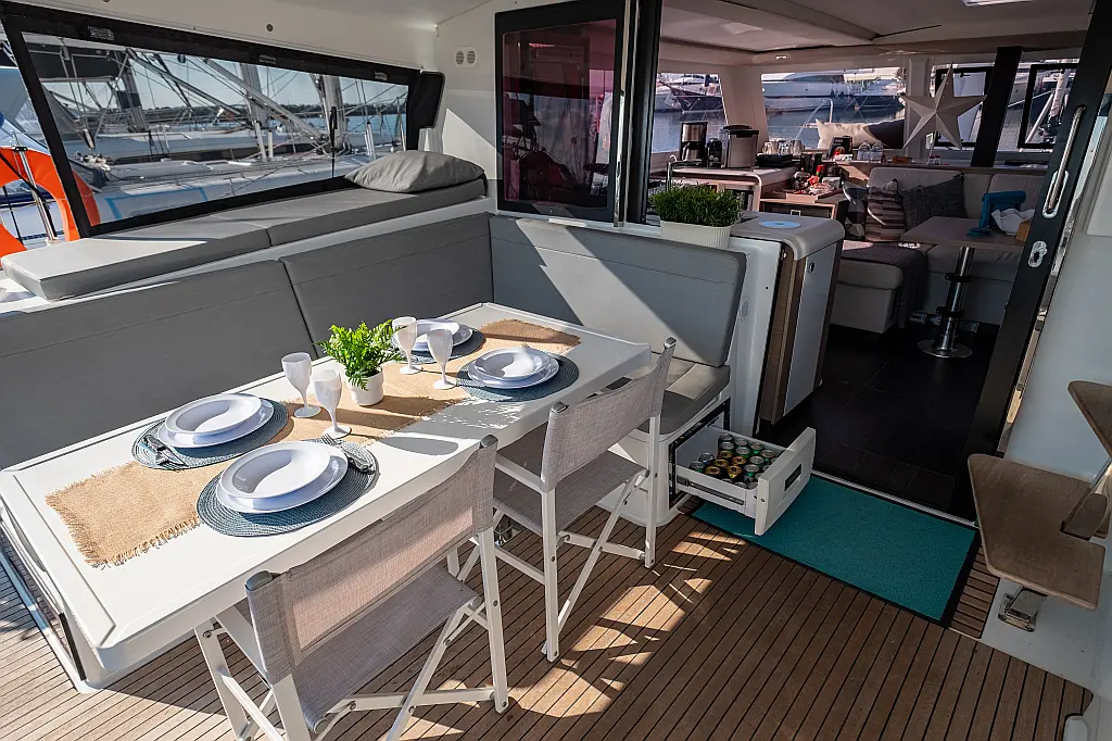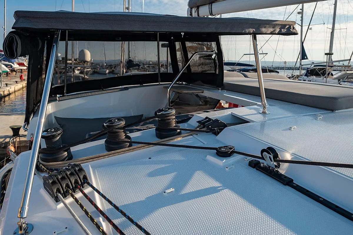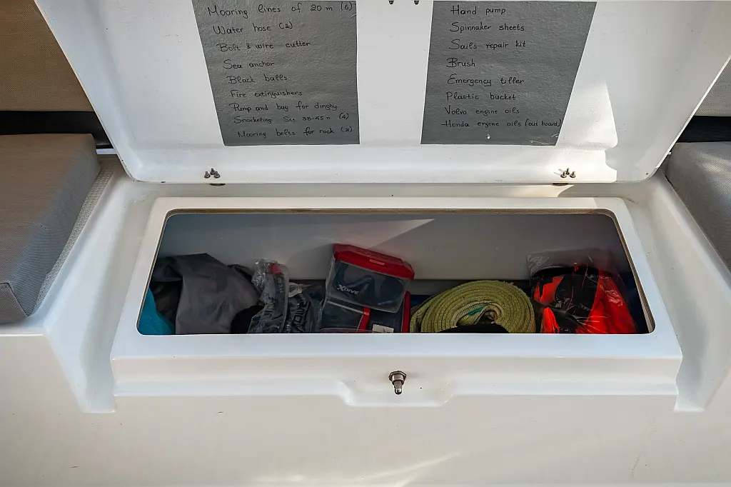 Kühlschrank, Lautsprecher im Cockpit, Elektrische Winch (Segel), Beiboot, Klimaanlage, Generator, Inverter, Elektrische Toilette, Solar-Panele, Wassermacher, Außenbordmotor, Cockpit-Kissen, Teak Cockpit
