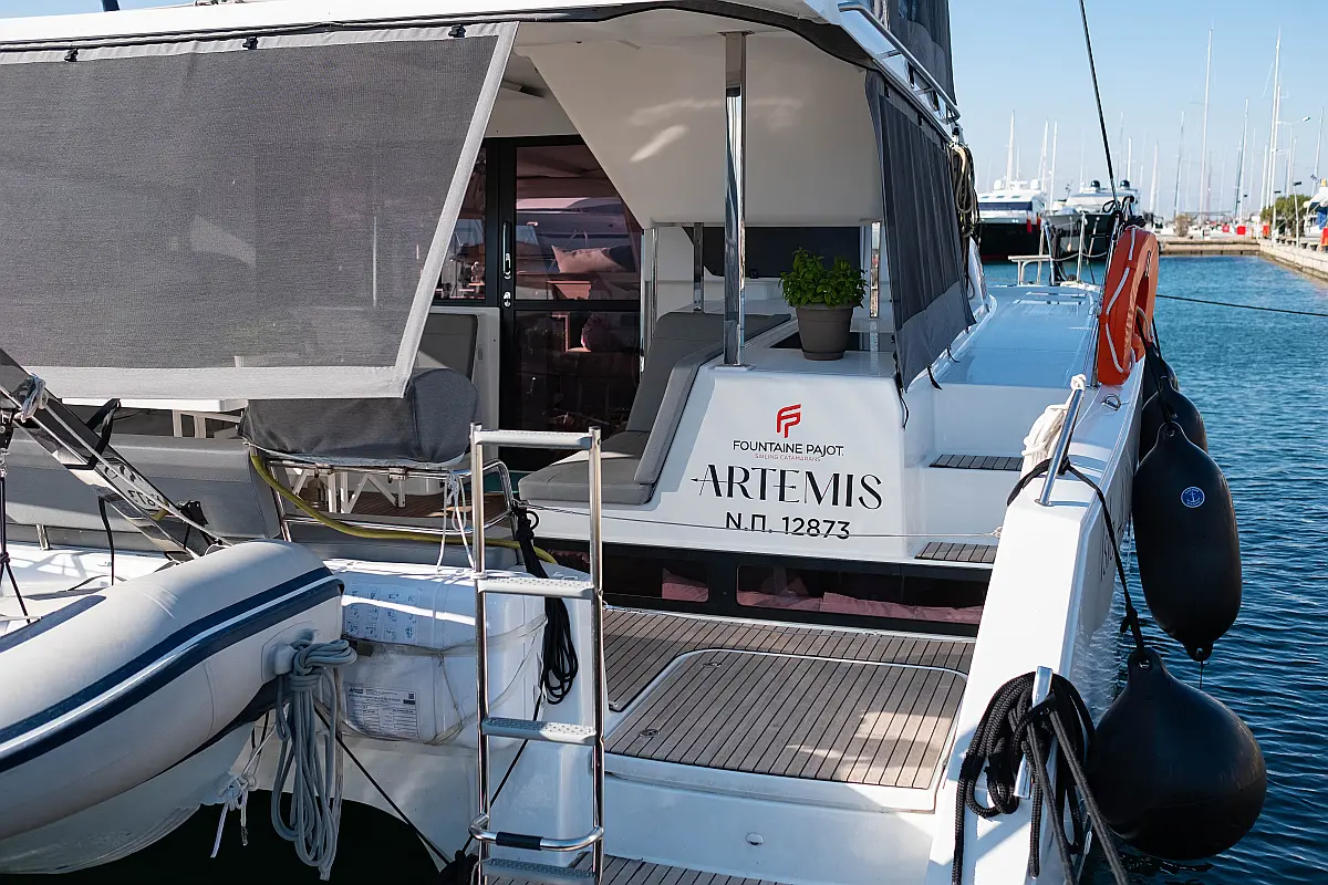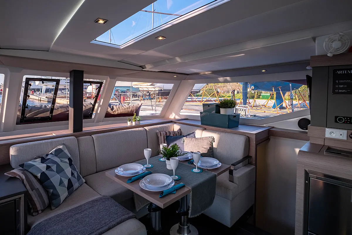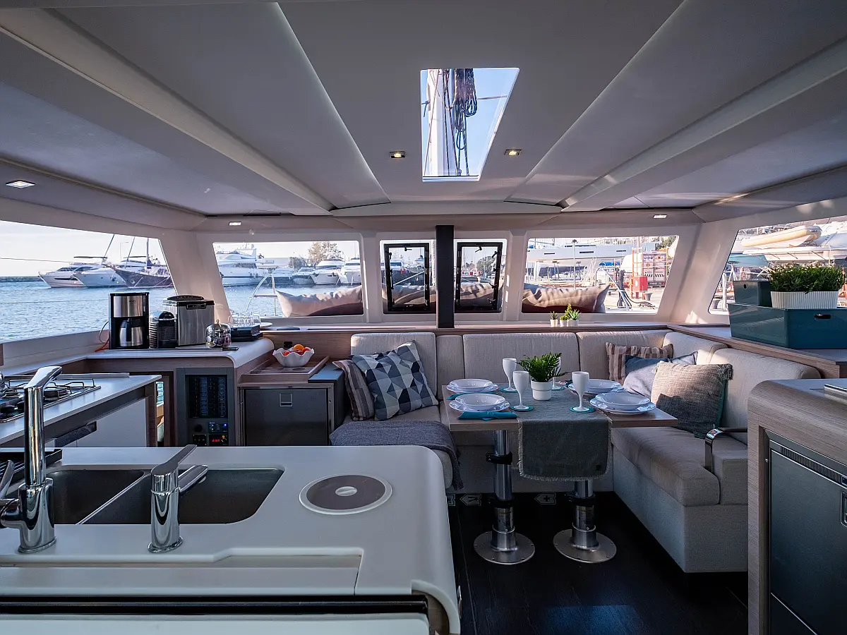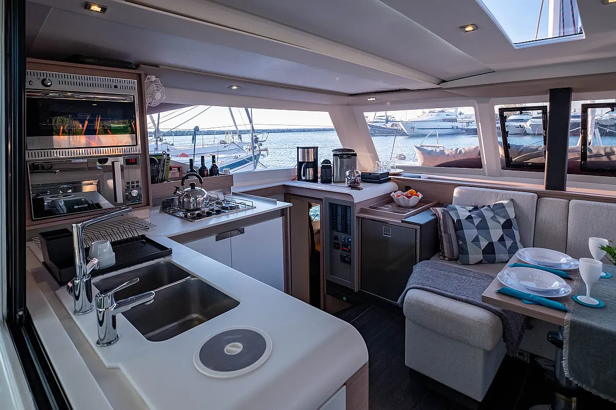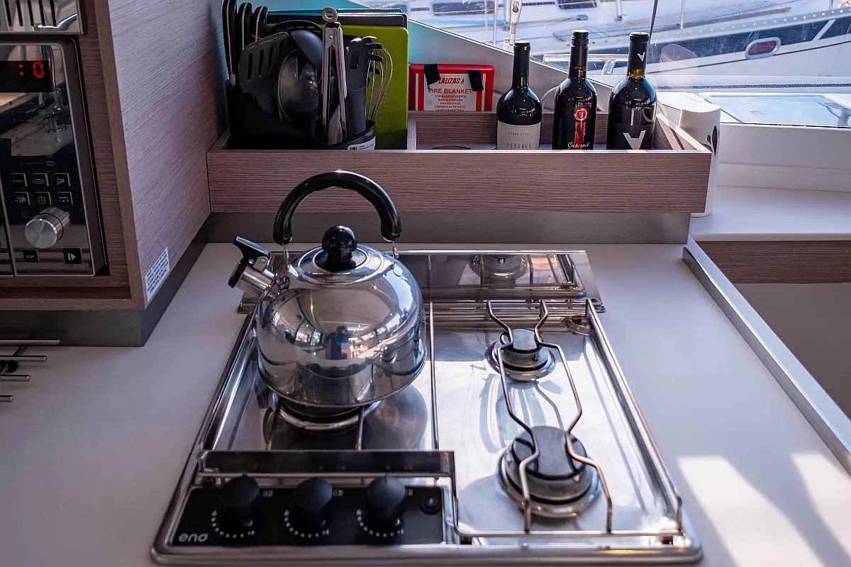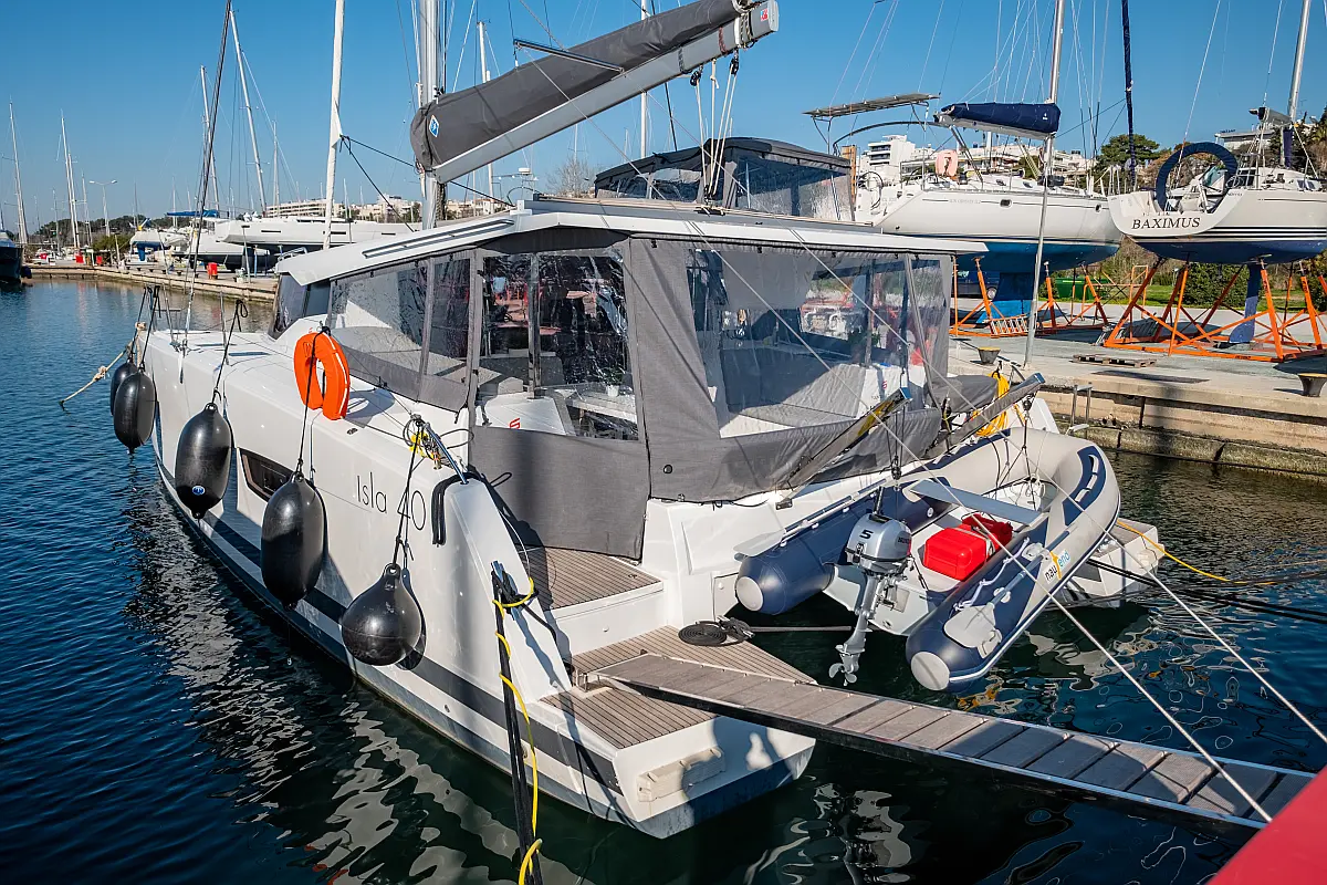 Kühlschrank, Lautsprecher im Cockpit, Elektrische Winch (Segel), Beiboot, Klimaanlage, Generator, Inverter, Elektrische Toilette, Solar-Panele, Wassermacher, Außenbordmotor, Cockpit-Kissen, Teak Cockpit