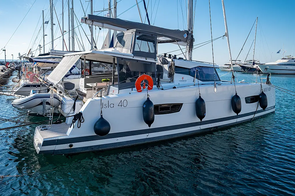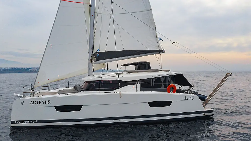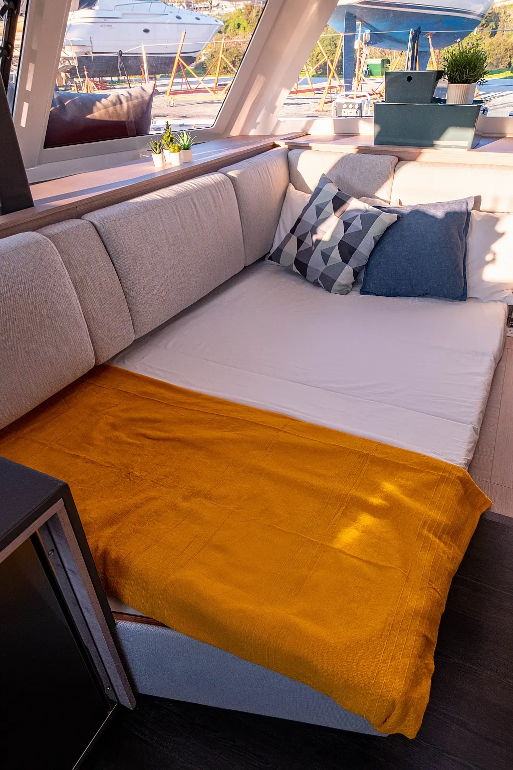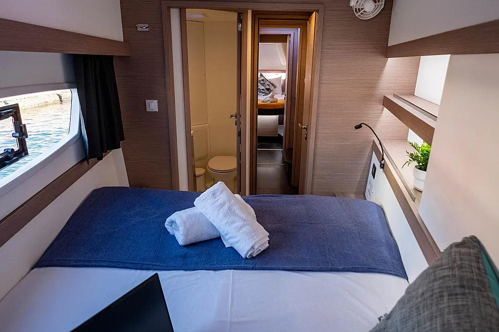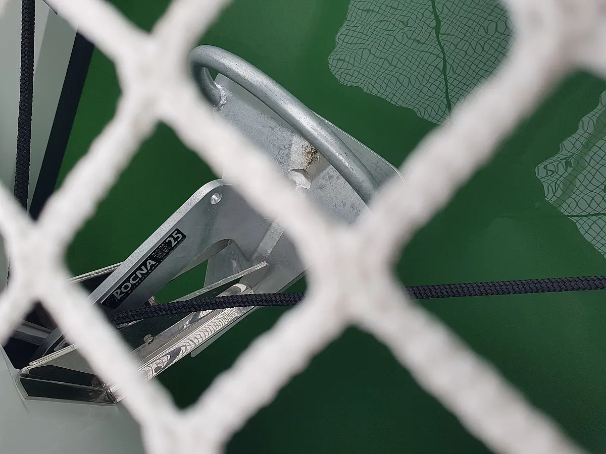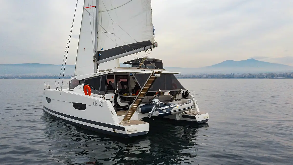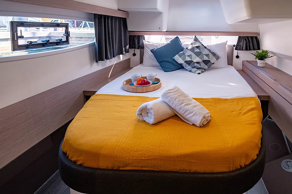 Kühlschrank, Lautsprecher im Cockpit, Elektrische Winch (Segel), Beiboot, Klimaanlage, Generator, Inverter, Elektrische Toilette, Solar-Panele, Wassermacher, Außenbordmotor, Cockpit-Kissen, Teak Cockpit