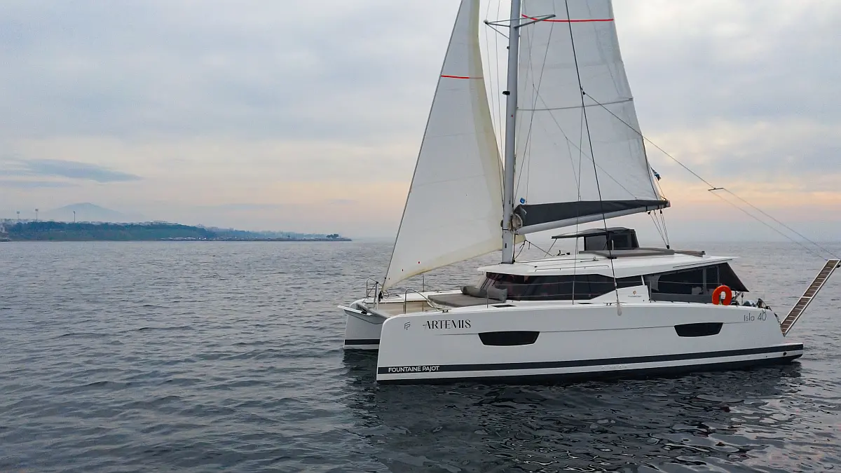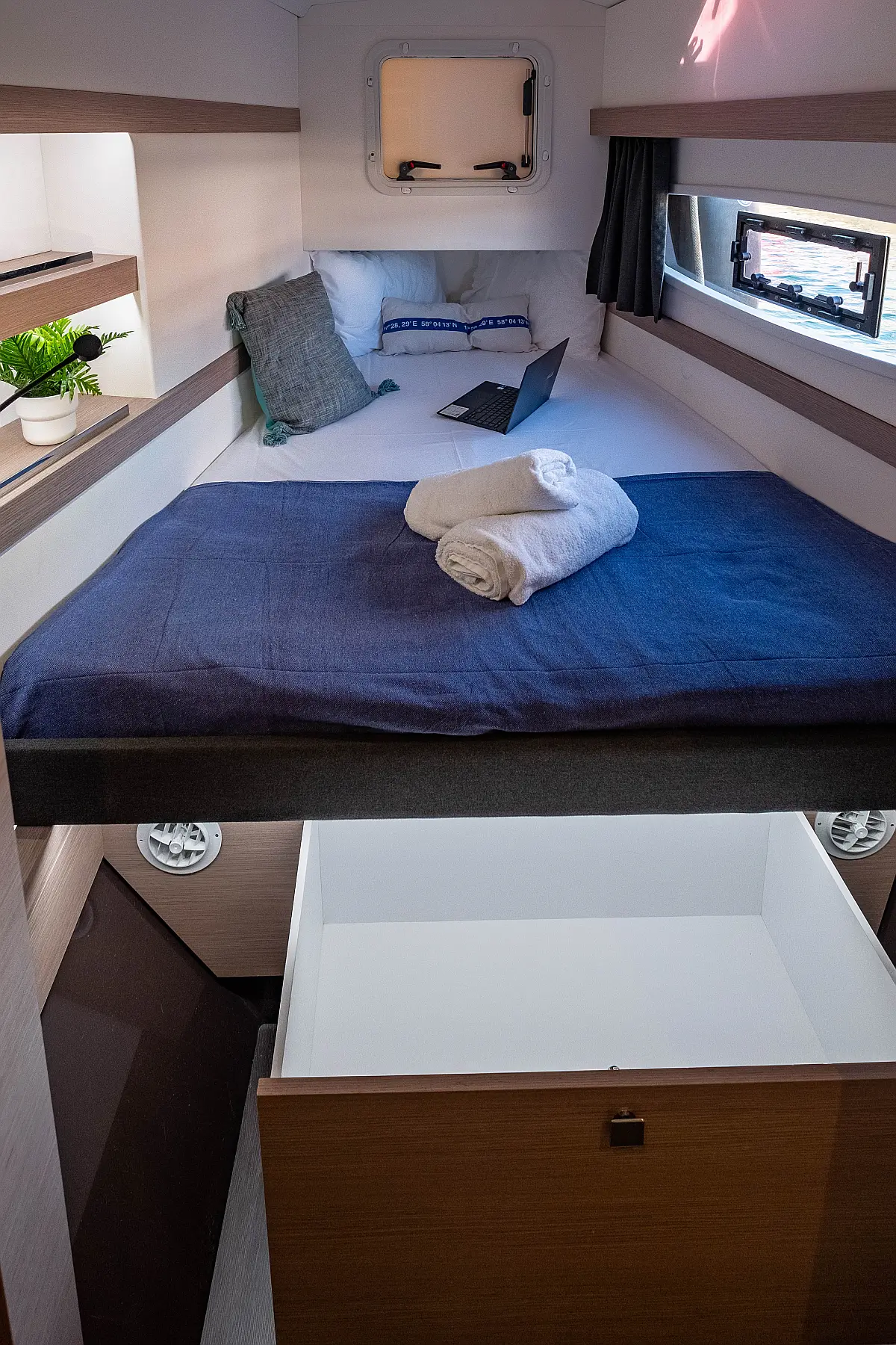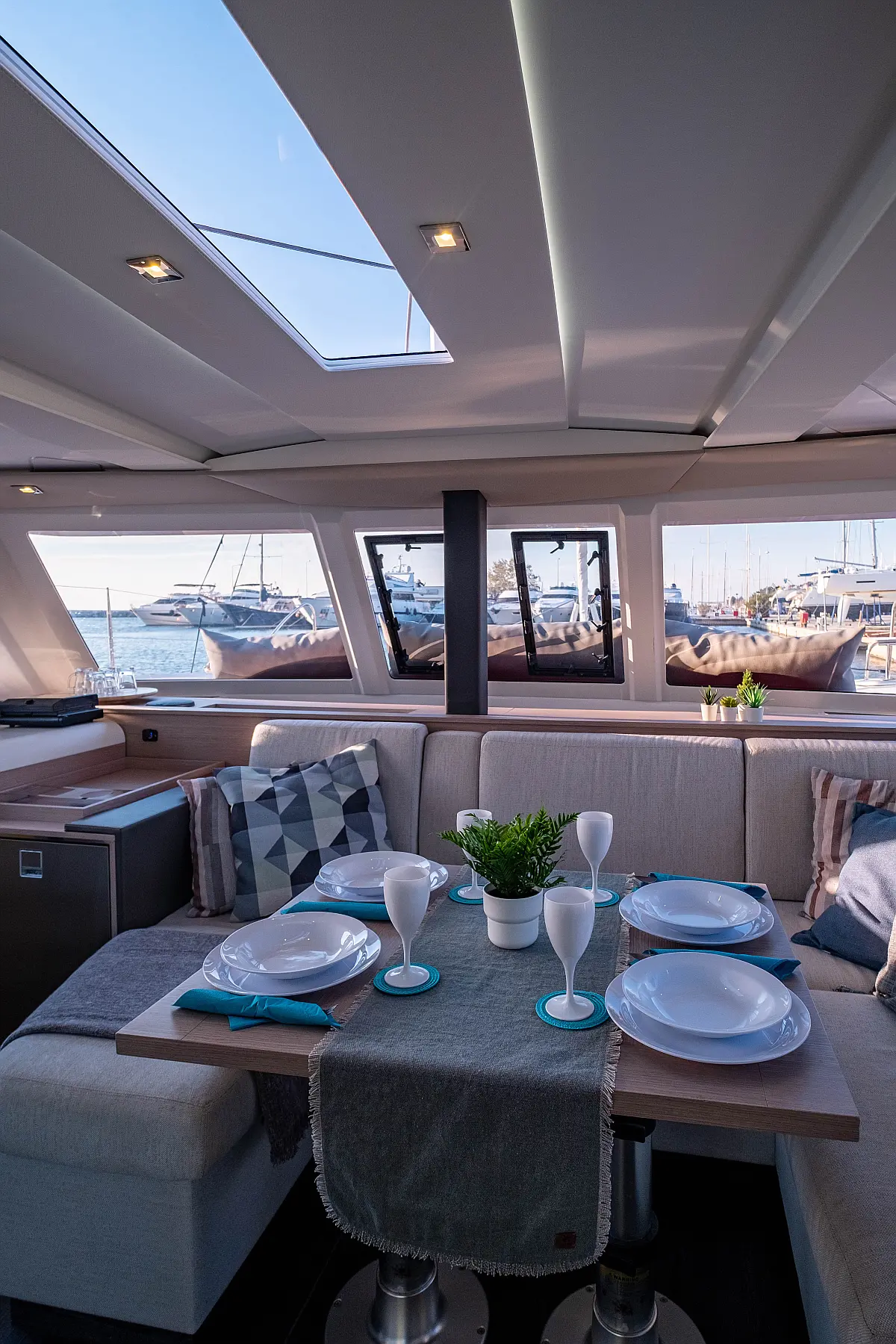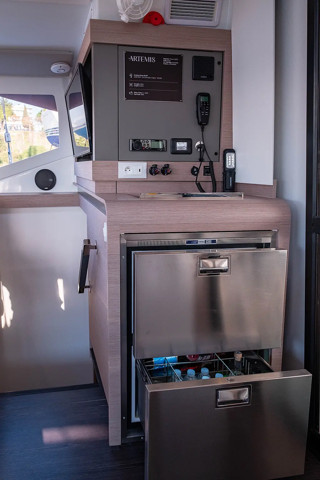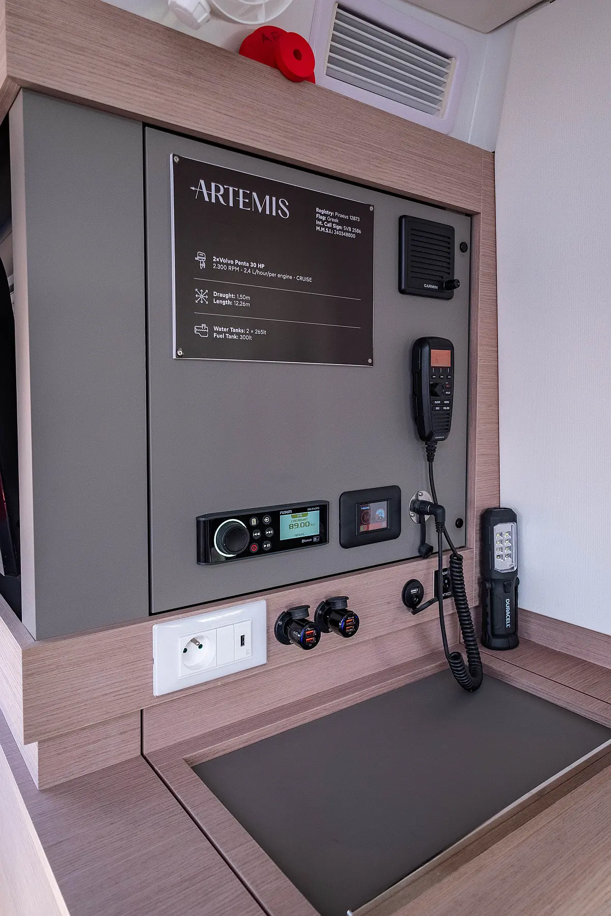 Kühlschrank, Lautsprecher im Cockpit, Elektrische Winch (Segel), Beiboot, Klimaanlage, Generator, Inverter, Elektrische Toilette, Solar-Panele, Wassermacher, Außenbordmotor, Cockpit-Kissen, Teak Cockpit