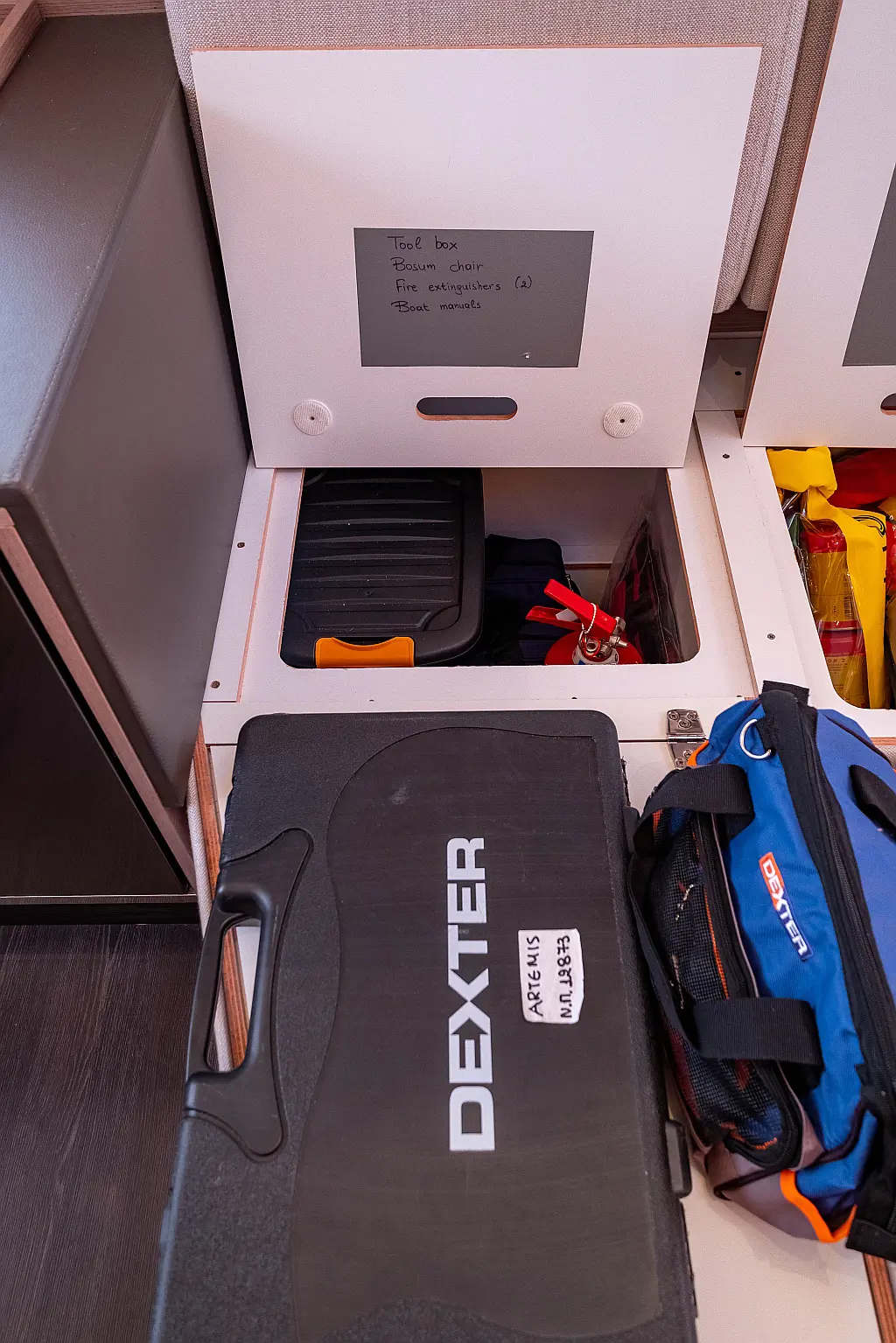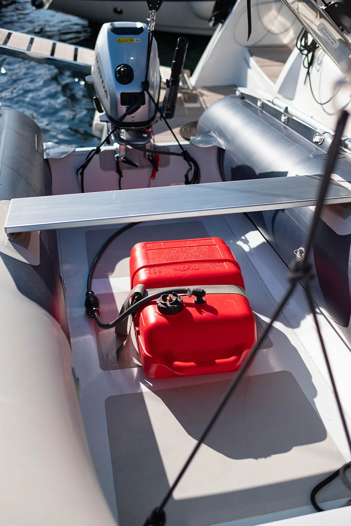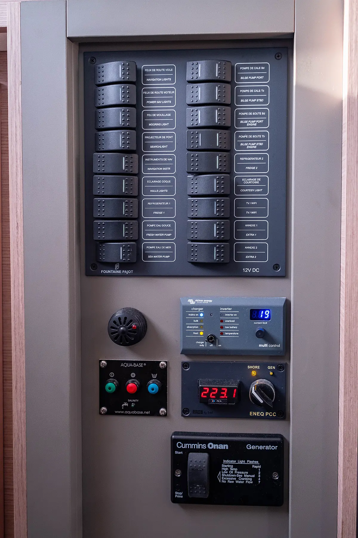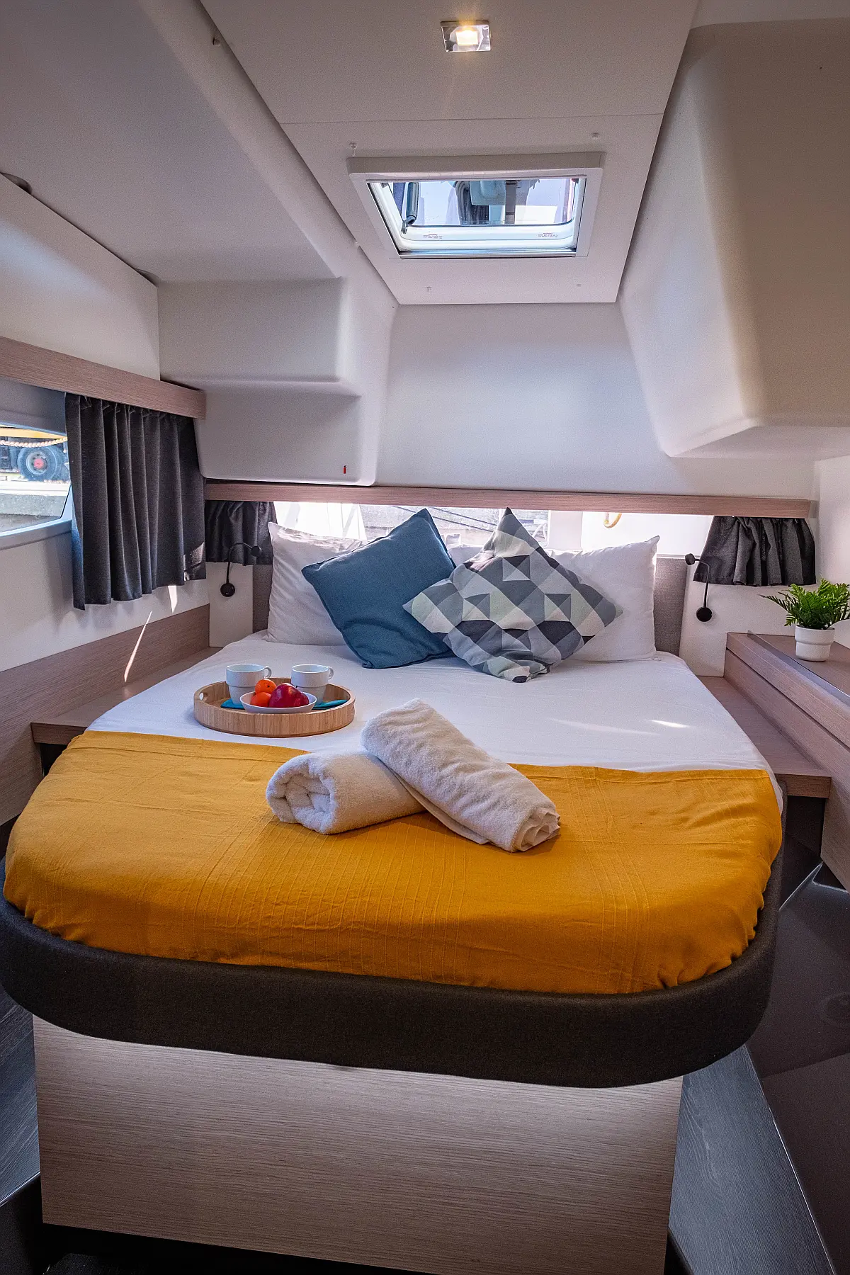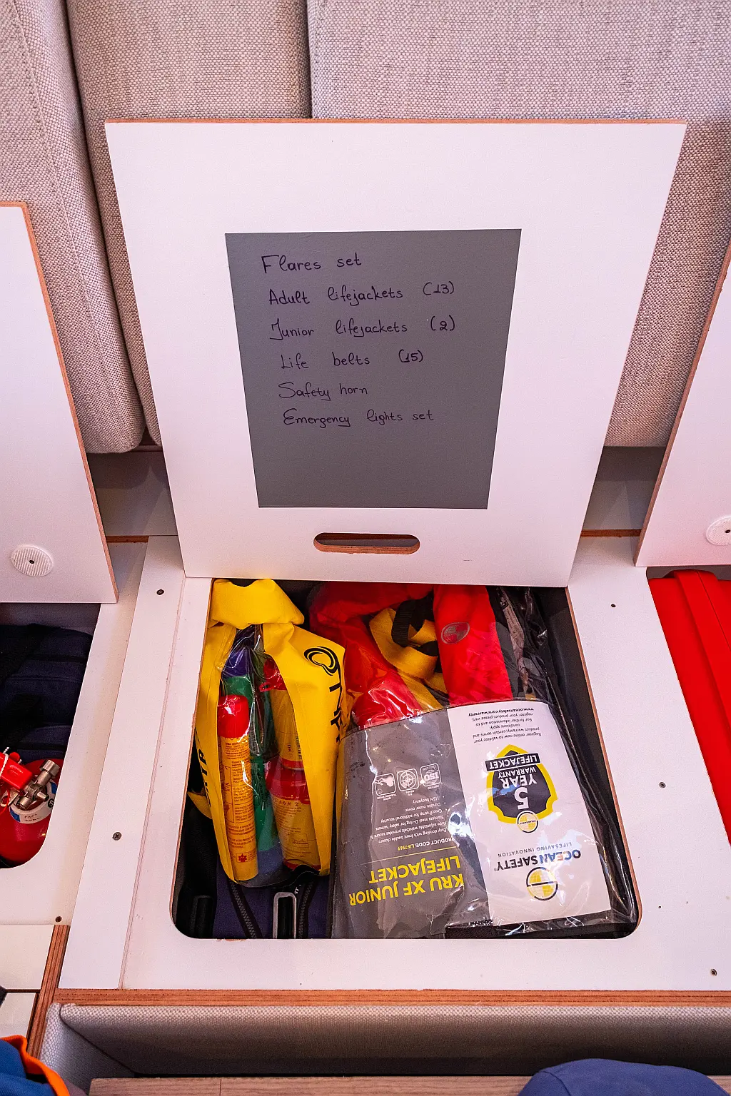 Kühlschrank, Lautsprecher im Cockpit, Elektrische Winch (Segel), Beiboot, Klimaanlage, Generator, Inverter, Elektrische Toilette, Solar-Panele, Wassermacher, Außenbordmotor, Cockpit-Kissen, Teak Cockpit