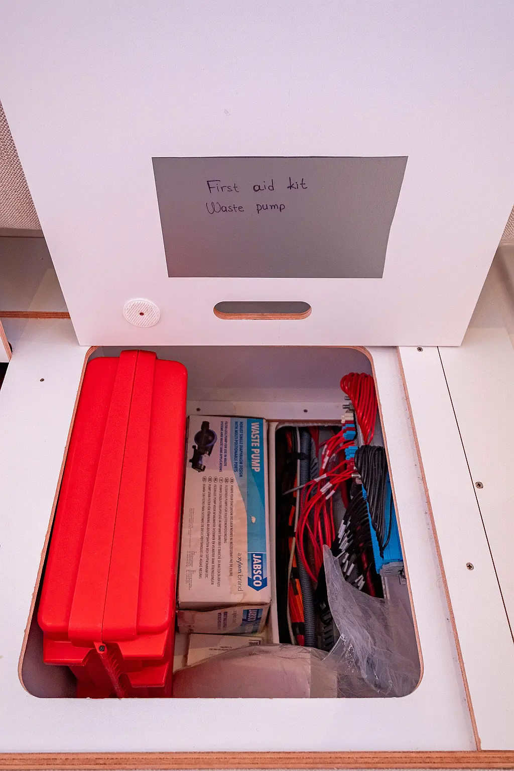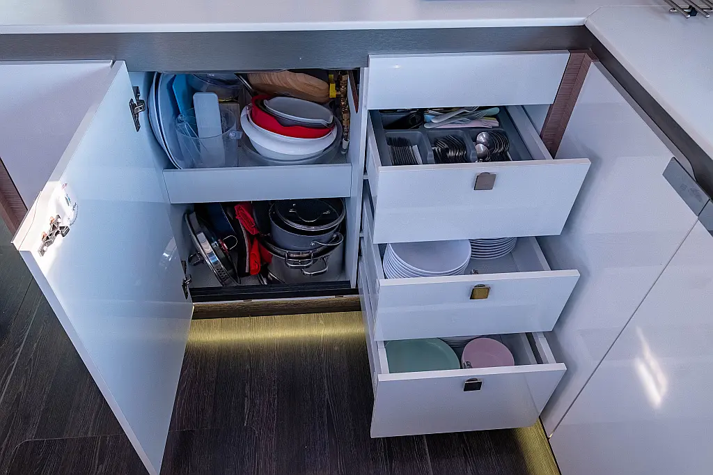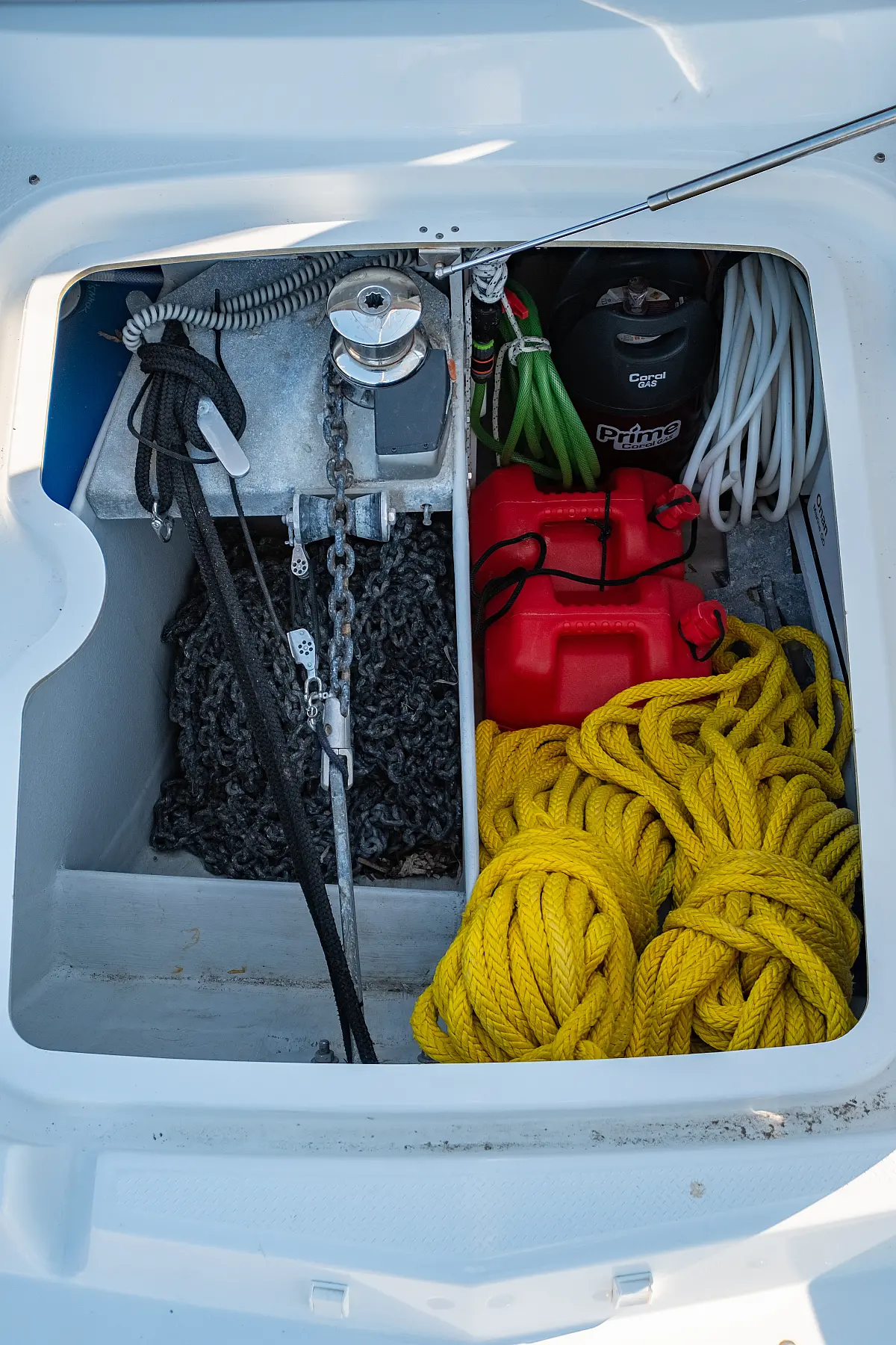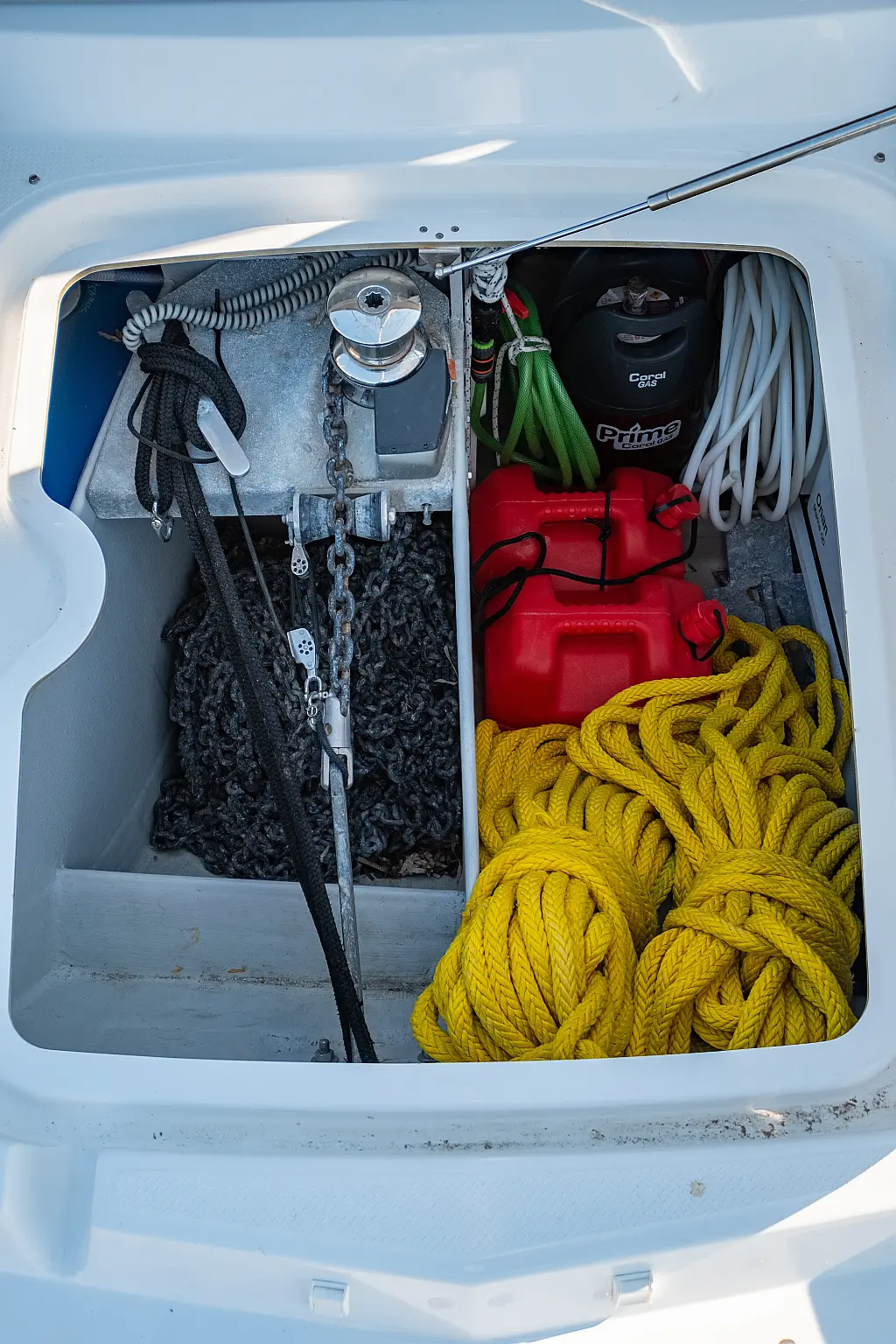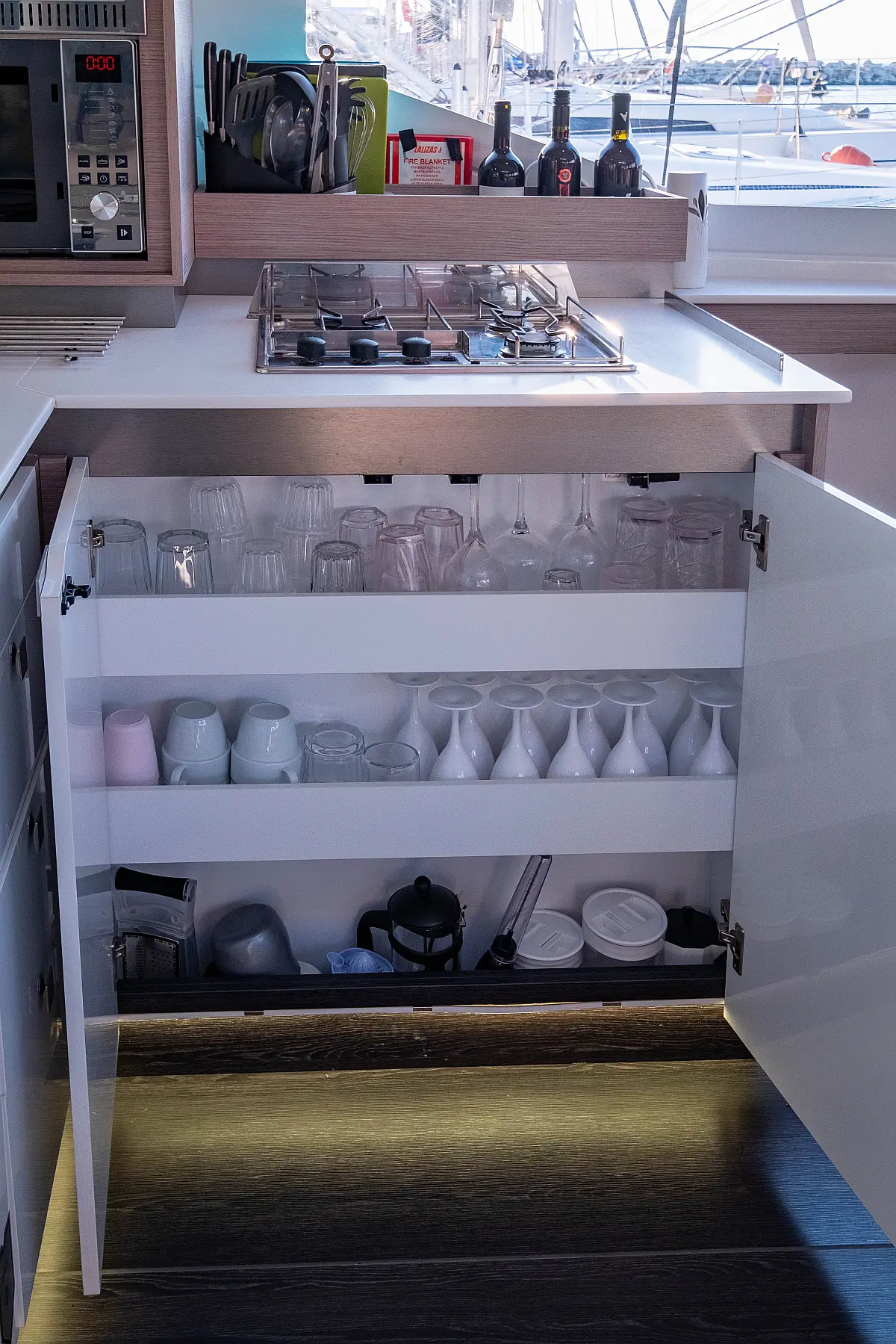 Kühlschrank, Lautsprecher im Cockpit, Elektrische Winch (Segel), Beiboot, Klimaanlage, Generator, Inverter, Elektrische Toilette, Solar-Panele, Wassermacher, Außenbordmotor, Cockpit-Kissen, Teak Cockpit